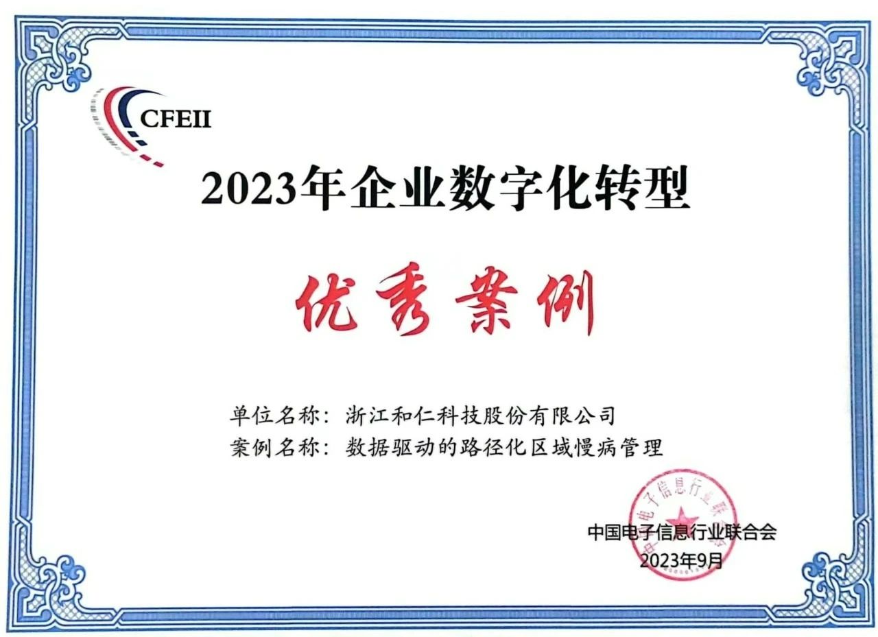 9月6日,中國電子信息行業聯合會在河北石家莊2023年中國國際數字經濟博覽會上,發布了“2023年企業數字化轉型優秀案例”,涵蓋了黨政、電力、工業、交通、金融、電信、能源、水利、農林、教育、醫療等行業領域。浙江和仁科技股份有限公司(以下簡稱“和仁科技”)申報的“數據驅動的路徑化區域慢病管理”榮獲醫療類“2023年企業數字化轉型優秀案例”。此次獲獎是和仁科技一直秉持科技服務健康的生動演繹,更好地詮釋了和仁科技精益求精、追求質量的工匠精神。